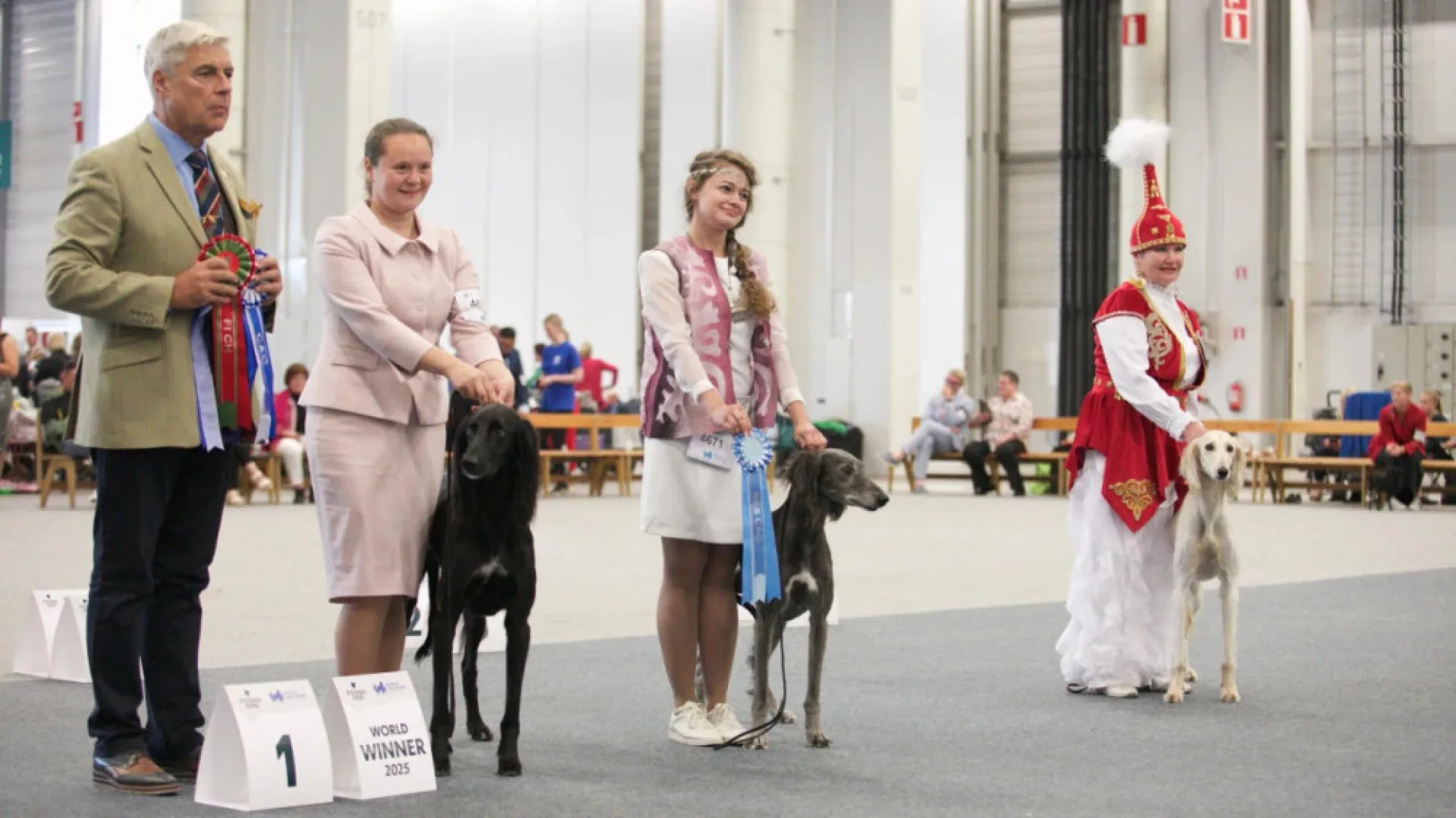 На этой выставке пять казахстанских тазы завоевали призовые места в своих рингах. Звание "Юный чемпион мира 2025 года" получил тазы по кличке Тамерлан, "Чемпионом мира" стал Лашын, "Чемпионкой мира" — Ару, "Вице-чемпионом мира" — Көксерек, а "Вице-чемпионкой мира" — Пана.